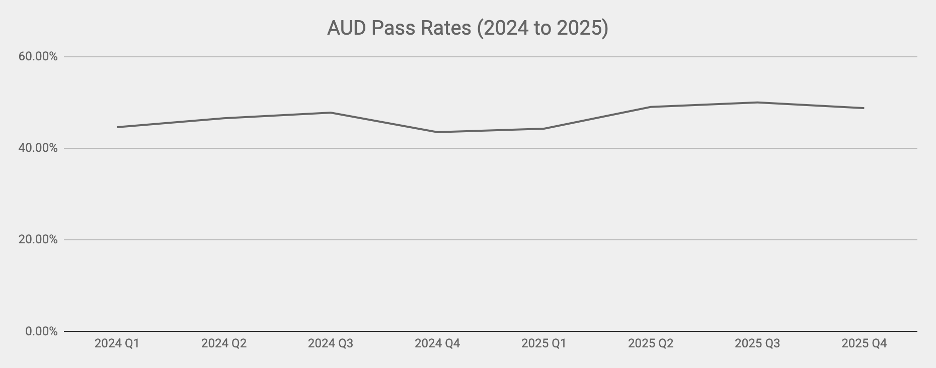 The cumulative pass rate for AUD in 2023 was 46.75%, and the pass rate for AUD in the second quarter of 2024 was just slightly less at 46.58%. So it seems that the difficulty level of the “old” AUD vs. the “new” AUD is about the same.