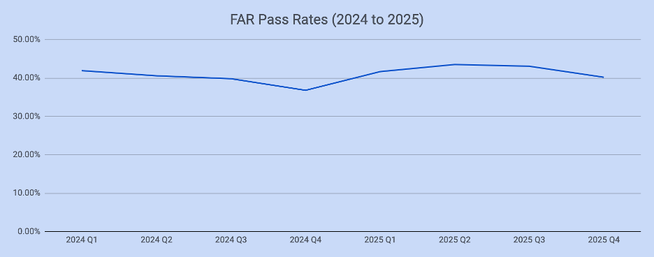 In 2023, only about 42% of test-takers passed FAR. Furthermore, the FAR pass rate in Q2 2024 was even lower at 40.58%. So be sure to study for FAR – it can be tough!