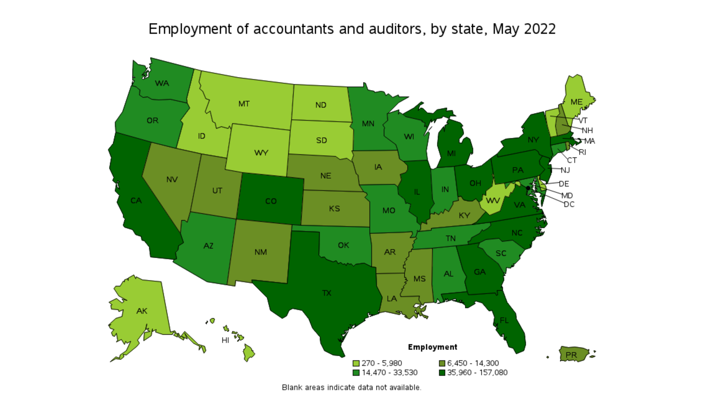 And the according to the US Bureau of Labor Statistics, these 5 states had the highest number of accountants and auditors in 2022 (which was the last year that this data was updated):